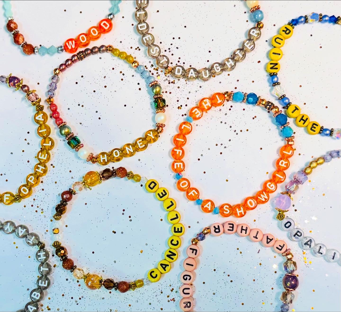 Celebrating the new album: The Life of a Showgirl has premiered! These bracelets are giving full spotlight energy — bold words, bright beads, and a little bit of showgirl sparkle.