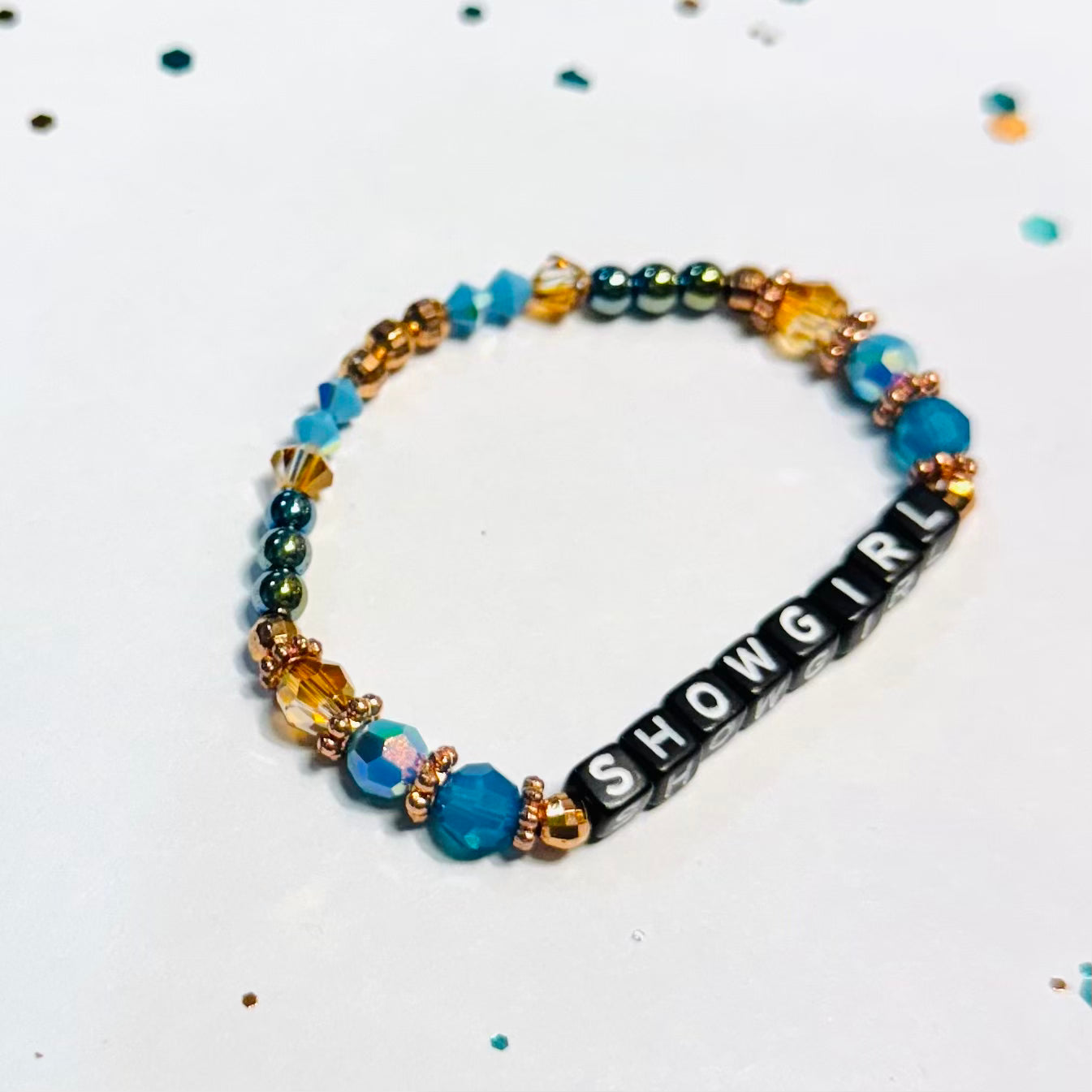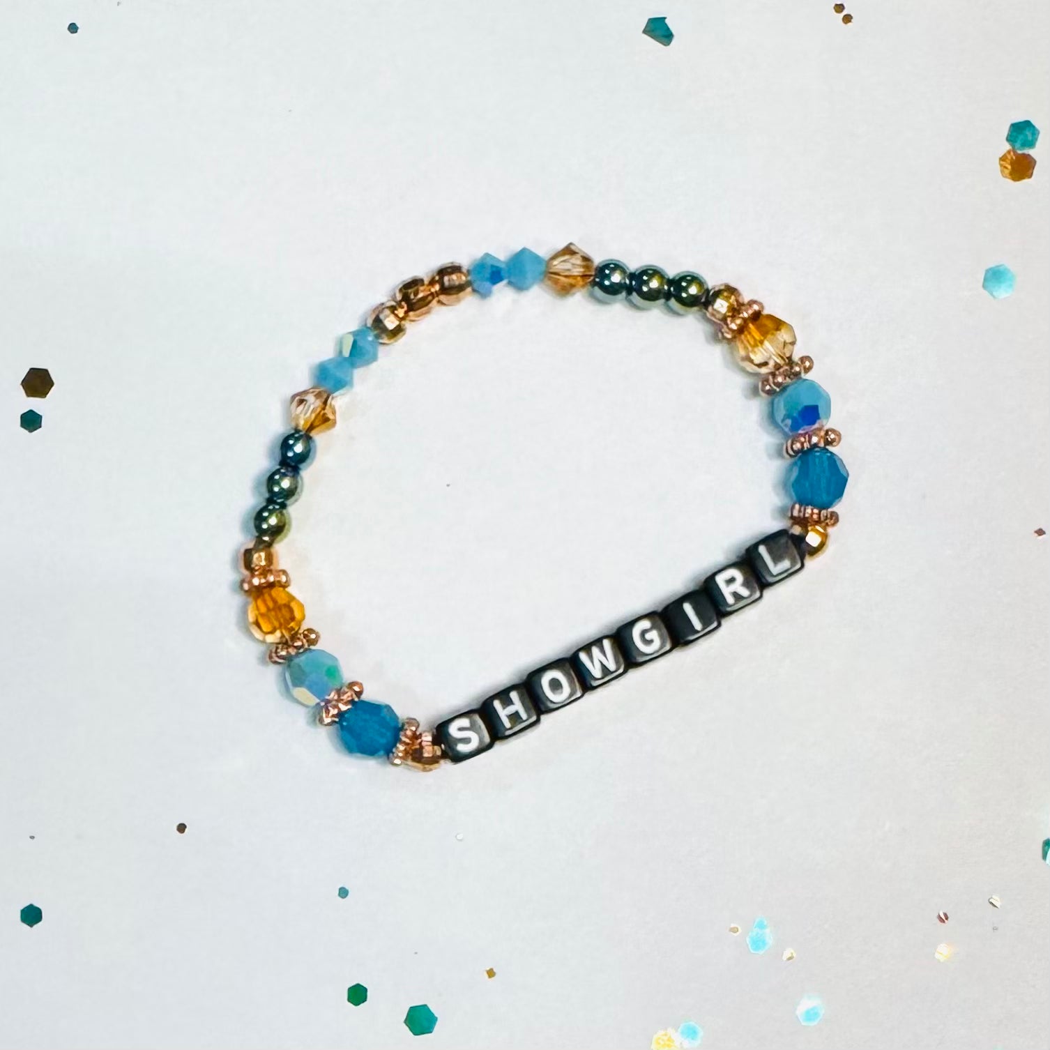 Celebrating the new album: The Life of a Showgirl has premiered! These bracelets are giving full spotlight energy — bold words, bright beads, and a little bit of showgirl sparkle.