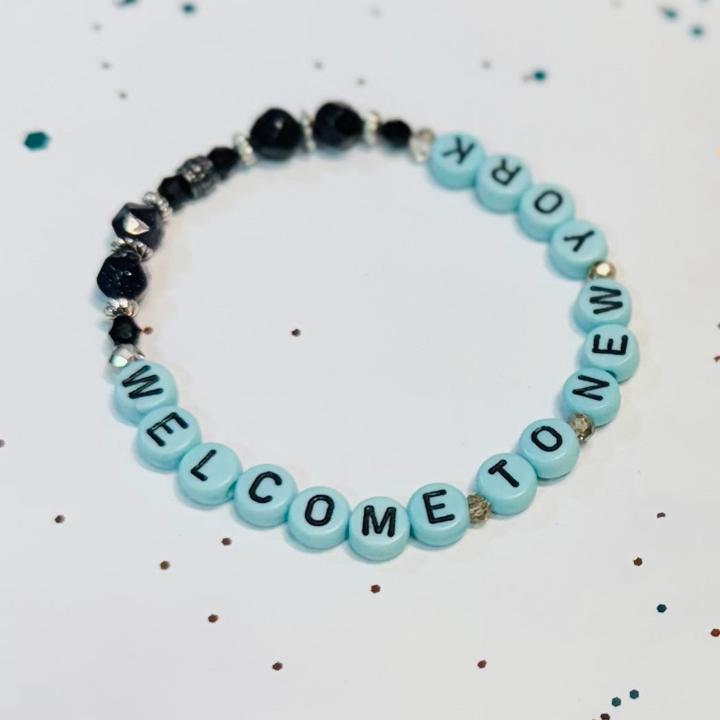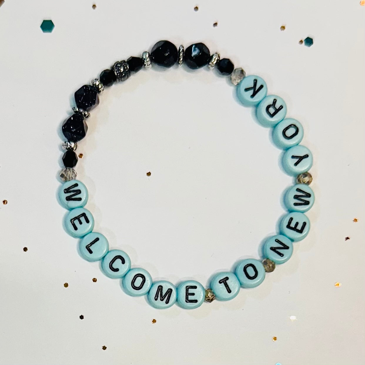 Step into the city that never sleeps with this sparkly “Welcome to New York” bracelet. Featuring glossy black and soft blue beads with shimmering silver accents, this stretchy statement piece captures the magic, energy, and excitement of New York.